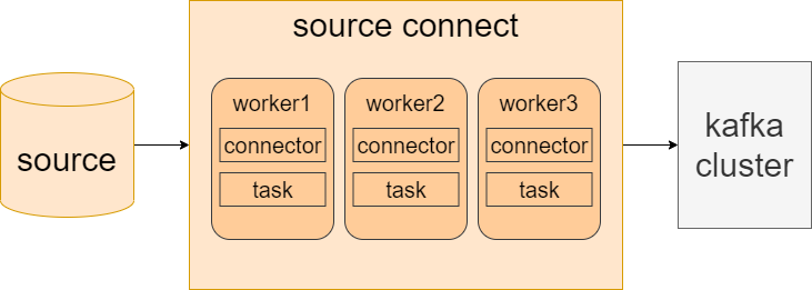 위 그림은 분산 모드 소스 커넥트를 그린 모습이다. 분산 모드의 경우 한 워커에서 장애가 생기더라도, 커넥터와 태스크들이 다른 워커로 이동하기 때문에 안정적인 서비스를 운영할 수 있다.
