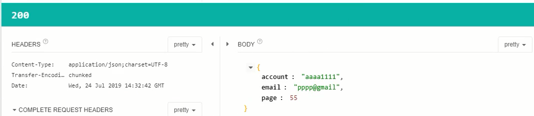 아래와 같이 Response에 200 OK로 뜨면 성공이며, BODY 부분에 위에서 입력한 BODY 내용과 동일한 값이 뜨는지 확인해보자.