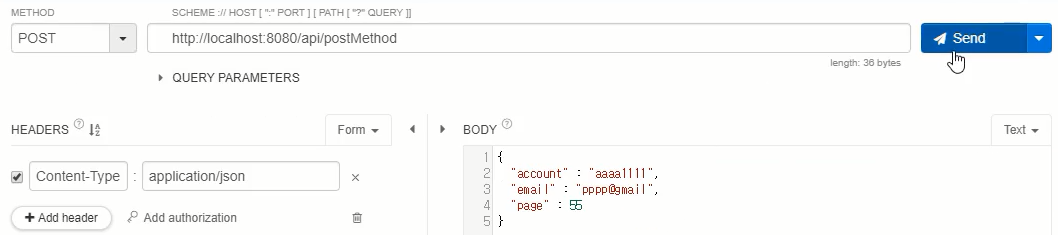 searchParam에 값이 정상적으로 들어갔는지 확인하기 위해 Talend API Tester를 이용해서 확인해보자. 아래와 같이 METHOD를 POST로 선택한 후, 작성한 주소랑 맞춰서 입력한다. Content-Type은 application/json으로 맞춰놓고, 이에 맞춰서 BODY에 JSON 형식으로 데이터를 넣어놓는다. 테스트용이니까 임의의 값을 직접 작성하면 되며, 나는 아래와 같이 데이터를 넣어놓았다. 이제 Send를 눌러보자.