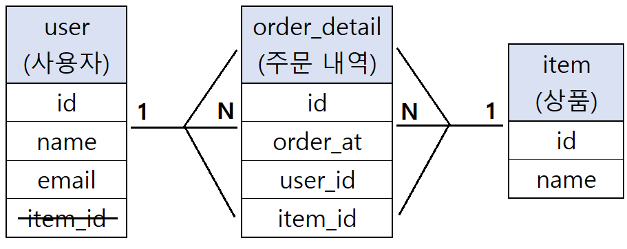 한 명의 user는 여러 개의 item을 구매할 수 있다. 따라서 1:N의 관계로 정의할 수 있다. 하지만 이 둘의 테이블을 한 번에 연결시키고자 한다면, 한 쪽에서 반대 쪽에 해당하는 id(외래키에 해당하는 index)를 가지고 있어야 한다. 하지만 user 테이블에서 item_id를 가지고 있다고 가정하면, 한 명의 user는 한 개의 item만 가질 수 있게 되는 꼴이므로, user 테이블에는 item_id가 들어갈 수 없다. 마찬가지로 item 테이블에서도 여러 명의 user가 같은 item을 가질 수 있으므로 여러 개의 user_id를 가질 수 없다. 그렇기 때문에 이 두 테이블은 각각의 키를 서로 연결할 수 없다. 따라서 중간에 order_detail(주문 내역) 테이블을 놓아서 아래와 같이 두 테이블을 연결해줘야 한다.