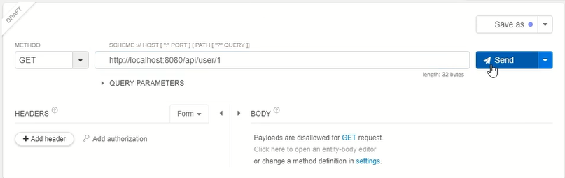 api/user/ 의 path parameter에 1번을 호출해보자. send를 누르면 아래와 같이 데이터가 잘 내려오는 것을 확인할 수 있다.