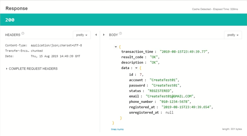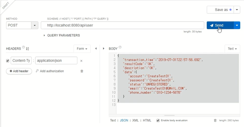 create이니까 POST 메서드를 선택하고, 위의 주소를 입력한다. https가 아니고 http로 입력해야 한다. BODY 부분에는 위와 같이 샘플 데이터를 넣어둔다.