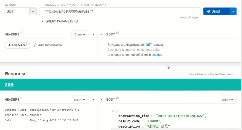 GET 메서드로 1번 user를 조회해보면 "데이터 없음"이라고 뜨면 정상적으로 삭제가 된 것이다.