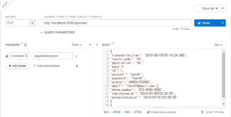 메서드 방식을 PUT 방식으로 바꾼 다음에, BODY 부분에 아까 복사한 것을 붙여넣기 한 다음에 위와 같이 몇 가지 값들을 직접 변경한 후 send를 누른다.