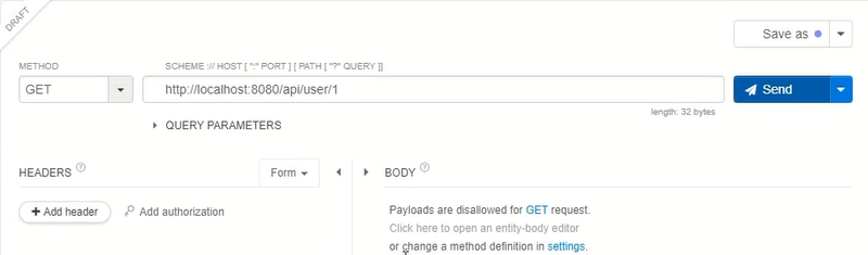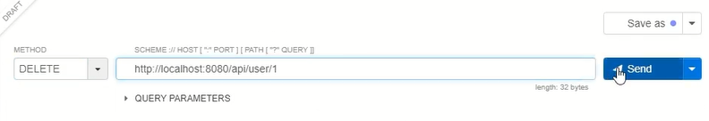 rest client 툴을 통해 1번 user를 delete해보자. 메서드 방식을 DELETE로 선택한 후 /api/user/1을 입력한 다음에 send를 누른다.