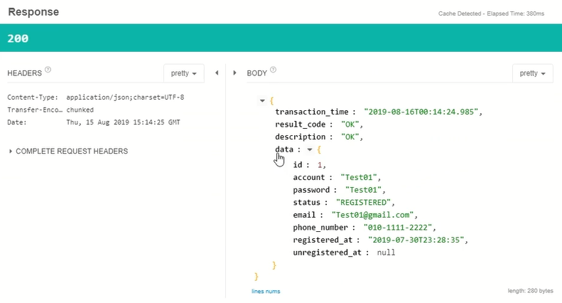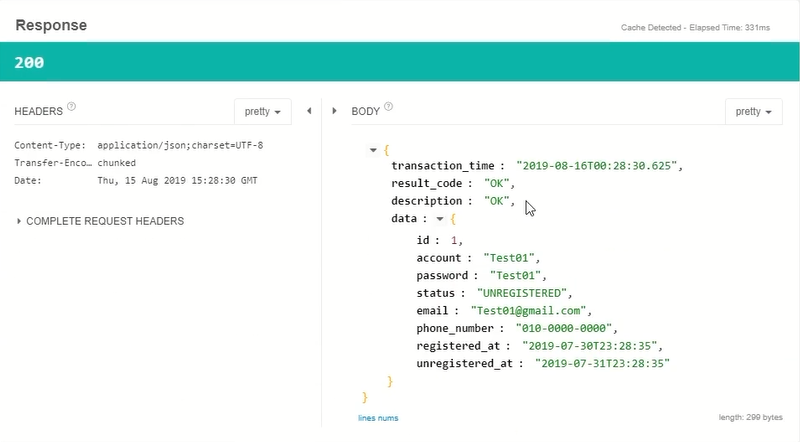 또한 위와 같이 100번 user로 없는 데이터를 delete한다고 하면 result_code가 "ERROR"로 뜨면서 "데이터 없음"이라고 뜬다.
