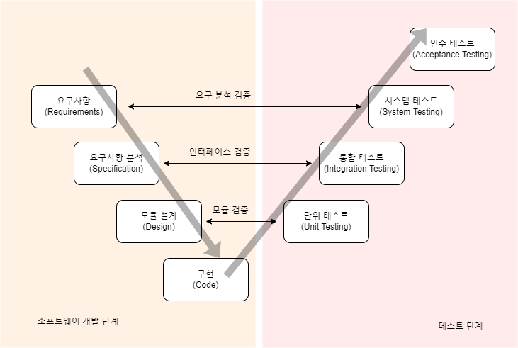 - 소프트웨어의 개발 단계에 따라 단위 테스트, 통합 테스트, 시스템 테스트, 인수 테스트로 분류된다.