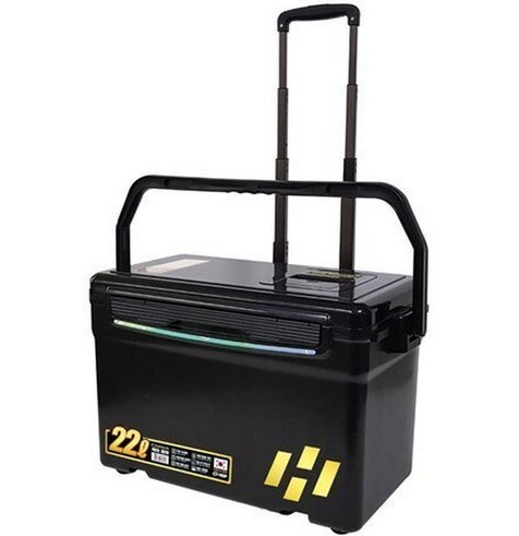 해동조구사의 아이스박스도 인기가 많습니다. 해동 아이스박스로는 카리스마 캐리어 아이스박스가 있습니다. 바퀴 달린 아이스박스로 캐리어처럼 끌고 다니기 편합니다. 아이스박스 자체만으로도 무게가 꽤 나가는데 안에 냉동 음식까지 넣고 나면 들어서 옮기기는 힘듭니다. 캐리어형 아이스박스는 지형 상관없이 끌고 다니기 편합니다. 22L 용량의 쿨러이며, 블랙 아이스박스로 구매하시면 막 쓰기에도 편하고 좋을 것 같네요.